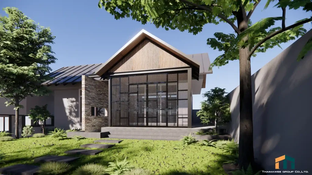 บ้านชั้นเดียวสไตล์ไทยประยุกต์ ผสมผสานความเป็นไทยเข้ากับความทันสมัย หลังคาทรงมะนิลาหรือทรงไทย วัสดุก่อสร้างมักเป็นไม้หรืออิฐ