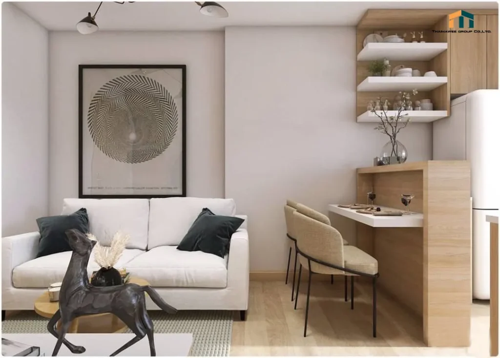 เฟอร์นิเจอร์กับของตกแต่งไม่จำเป็นต้องเยอะ เอาแค่ที่พอดี อะไรไม่จำเป็นก็ไม่ต้องใส่เข้าไปในห้อง นอกจากนี้ยังเน้นความสว่างจากแสงไฟธรรมชาติเป็นหลัก และใช้โทนสีมินิมอล ทั้งโซฟา โต๊ะ เก้าอี้